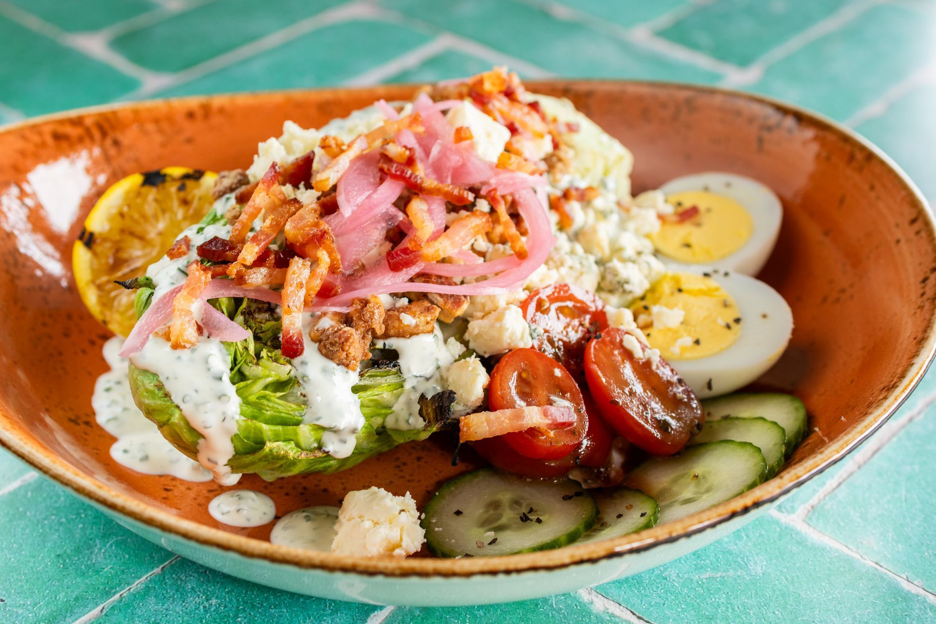 smoked blue cheese, cherrywood bacon, candied pecans, balsamic marinated tomatoes, hard boiled egg, cucumbers & pickled red onion with buttermilk herb ranch dressing