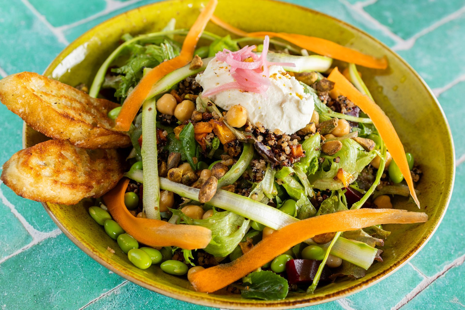 lemon quinoa, edamame, chickepeas, pickled red onion & pistachios